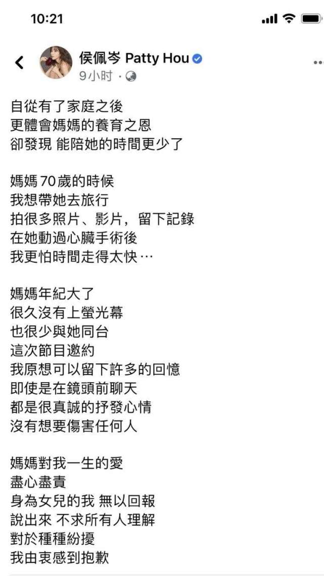 侯佩岑和妈妈在节目中谈及了妈妈过往的时候,母女相互道歉。侯佩岑说理解妈妈,毕竟成年人的世界不容易。很多网友看了侯佩岑母女深情拥抱的场景后评论说,搞错了吧?感情侯佩岑的妈妈受了什么委屈?明明是她伤害了两位女人和两个家庭啊!