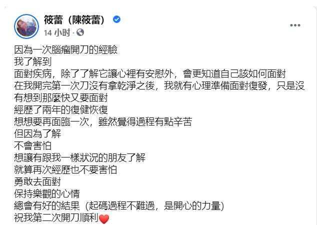 近期,赵英俊、吴孟达等明星的离世引发了大众对于艺人健康的关注。生命是宝贵的,粉丝们还是希望自家爱豆能够保重身体。近日,又一位女星的健康出了问题,她的身体状况让人担忧。原来,女星陈筱蕾的脑瘤复发了。