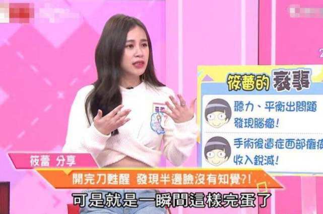 万幸的是陈筱蕾在就医后被确诊是良性肿瘤,医生为她做了脑瘤切除手术。但术后,陈筱蕾出现了面瘫的现象。虽然患病,但陈筱蕾一直很坚强,只是让人没想到的是陈筱蕾的病情复发了,脑瘤又长了。陈筱蕾坦言没想到脑瘤会那么快复发。