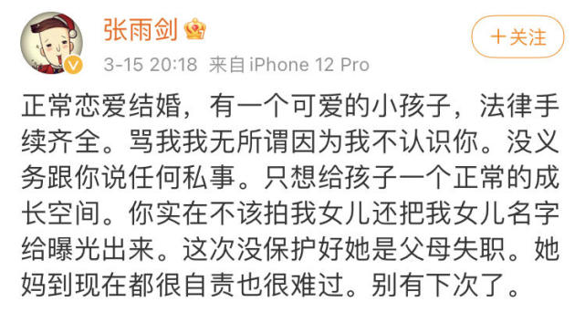 一些网友的口气并不友好,吐槽张雨剑没担当,不出来认孩子。15日晚,张雨剑被迫发文了,他承认孩子是他的,并表示他和吴倩是正常恋爱结婚,法律手续齐全。张雨剑发文说骂他无所谓,他没必要跟别人说私事,但是不应该曝光她女儿的名字。