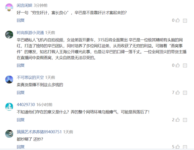 辛巴晒私人飞机内自拍视频,真的是壕气冲天了。不过视频里的一句话却刺痛了网友的神经。辛巴在视频中宣称“穷生奸计,富长良心”,让网友看不下去了。辛巴不是一直说自己是农民的儿子吗?他难道是靠奸计富起来的吗?卖假燕窝是有良心的体现吗?