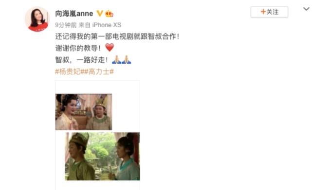 港姐冠军向海岚曾与廖启智合作过古装剧《杨贵妃》,在剧中有过很多对手戏。向海岚发文感谢对方的教导,希望其走好。