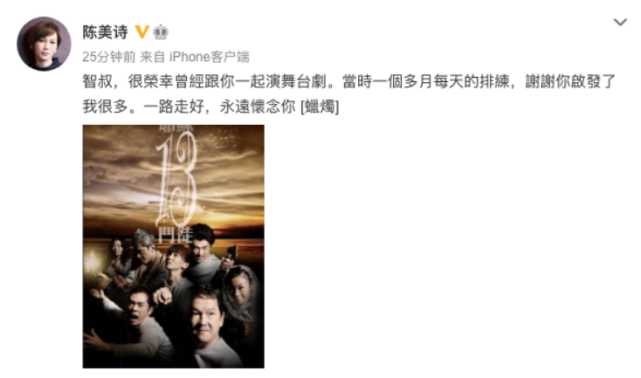 80后女星陈美诗演过《读心神探》、《掌上明珠》等影视剧,她是男星孙耀威的老婆。陈美诗和廖启智合演过舞台剧,她说廖启智给过她很多启发,希望廖启智一路走好,永远怀念智叔!