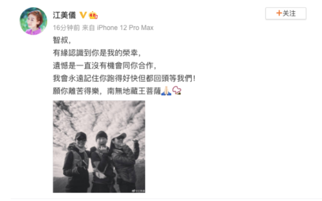 江美仪与廖启智都是爬山队成员,她发文表示有缘认识智叔,是她的荣幸。遗憾没有机会合作,她会永远记住智叔跑得很快,但总会回头等人,愿对方离苦得乐。