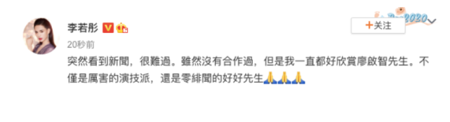 李若彤和廖启智没有合作过,但她也有发文悼念廖启智。李若彤说她一直都很欣赏廖启智,他是实力派演员,还是零绯闻好好先生。看得出来,廖启智在圈内的口碑很好。