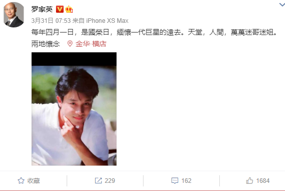 罗家英早在3月31日就发文缅怀了张国荣,前几天老一代港星廖启智也离开了人世,也是有众多明星网友希望智叔一路走好,吴孟达也因病离开了大家,让人感慨万分。