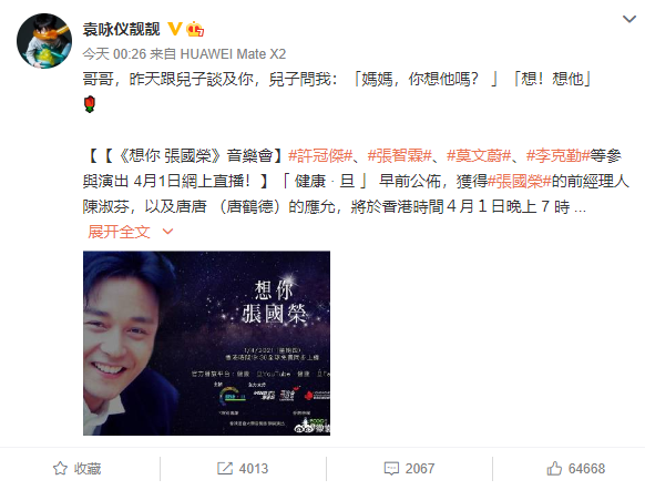 袁咏仪作为张国荣的圈内好友,两人合作的《金枝玉叶》播出后更是传出绯闻,袁咏仪更是在电视节目中直言有被张国荣电到,可见哥哥是当时多少少女心中的梦中情人。今天更是大方分享了和儿子魔童关于张国荣的对话表达了对张国荣的想念。