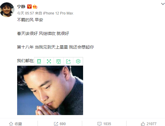 张国荣在香港拥有一众粉丝,而在内地的影响力也是不容小觑,今天也是有很多明星纷纷发文悼念他们心中的偶像。宁静一早便发文表达了对张国荣的思念之情,当见到星星时,依旧会想起你,这何尝不是最心底的思念呢?