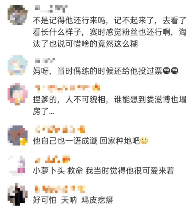 虽然如此,他还不算红,而且这次的事件也让很多网友觉得他的人设要崩塌了,还有网友说自己还曾经给他投过票,现在这样的话也算是房子塌了。也有网友留言道他现在这样也算是一语成谶,现在真的是要回家种地了。