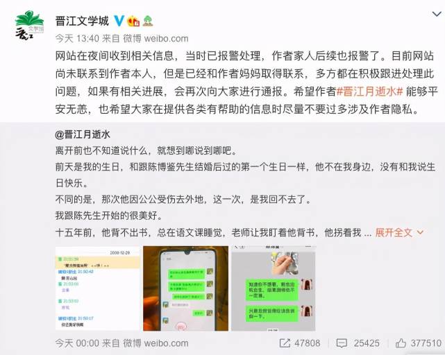 “晋江月逝水”的博文很长,透过文字可见她的心境,相恋15年男方多次出轨,就如她所说,她很累,撑不下去了。这位作家疑似失踪了,很多网友担心她会想不开。而更让人担心的是她还怀着孕。陈博鉴如何回应此事呢?他说没离婚是因为“晋江月逝水”把钱算得很精,言下之意就是他们两人在财产分割方面还存在分歧,所以还没离婚。