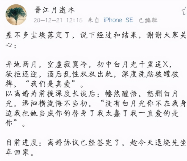 原来博主“晋江月逝水”在微博发了一篇博文,讲述了她和她老公陈博鉴从相爱到结婚的经历。晋江月逝水跟她老公曾是同学,从她的描述来看,男方曾经也爱过她,做过让她感动的事情。但是后来男方却多次婚内出轨。
