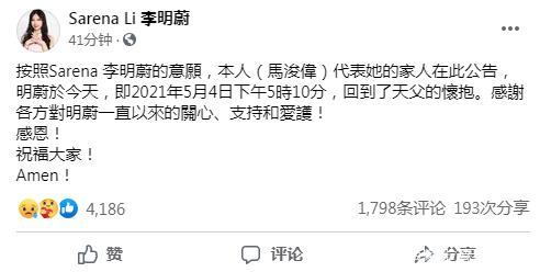5月4日的时候,男星马浚伟替李明蔚更新了社交账号,代表她的家人宣布了李明蔚离世的消息。李明蔚在5月4日下午病逝,享年31岁。马浚伟也有在个人社交平台发文悼念李明蔚,他表示会和李明蔚在天家再会的。