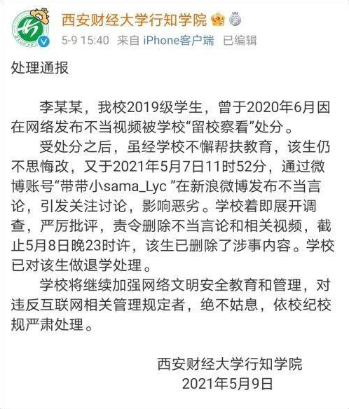 5月9日下午西安某高校公布了对学生李某某的处理结果,李某某在网上发布不当言论,诅咒病魔战胜患病女孩。此外该学生还曾在直播的时候搭讪女生未果,然后用侮辱性词汇形容女生,并在直播中对女孩的长相评头论足。
