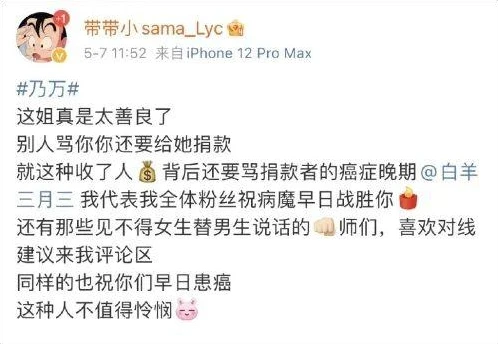 乃万发声觉得自己没有做错。不知为何,乃万晒出了她帮助癌症女孩的微博。但是有网友却去骂这位患病的女孩,甚至诅咒她早日归西。乃万事件持续发酵,这位患病女孩疑似惨遭网曝。近日,一位大学生因为辱骂患病女孩而被退学了。