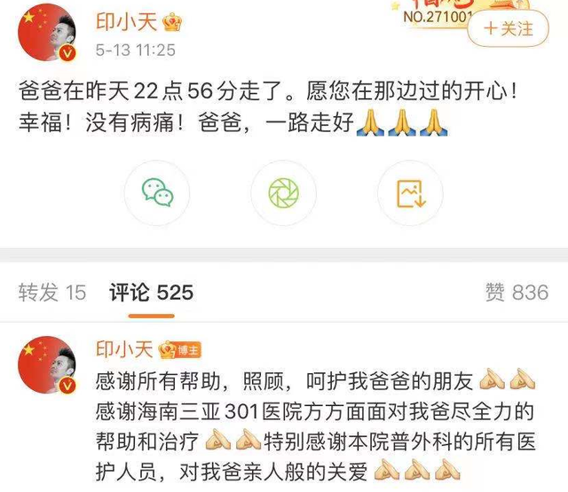 印小天是娱乐圈有名的孝子,他曾四处为父亲寻医问药。父亲走了,印小天却没忘感谢医护人员的付出,他对治疗,照顾过他父亲的医护人员表示了感谢。很多网友表示希望印小天节哀。陈志朋、李依晓、苏醒等明星也有安慰印小天,劝他节哀。