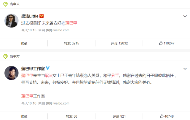 近日,演员蒲巴甲与梁洁分别在微博上官宣恋情结束,两人和平分手。而网友们面对二人的分手却送上了祝福,恭喜二人分手。这是为何呢?