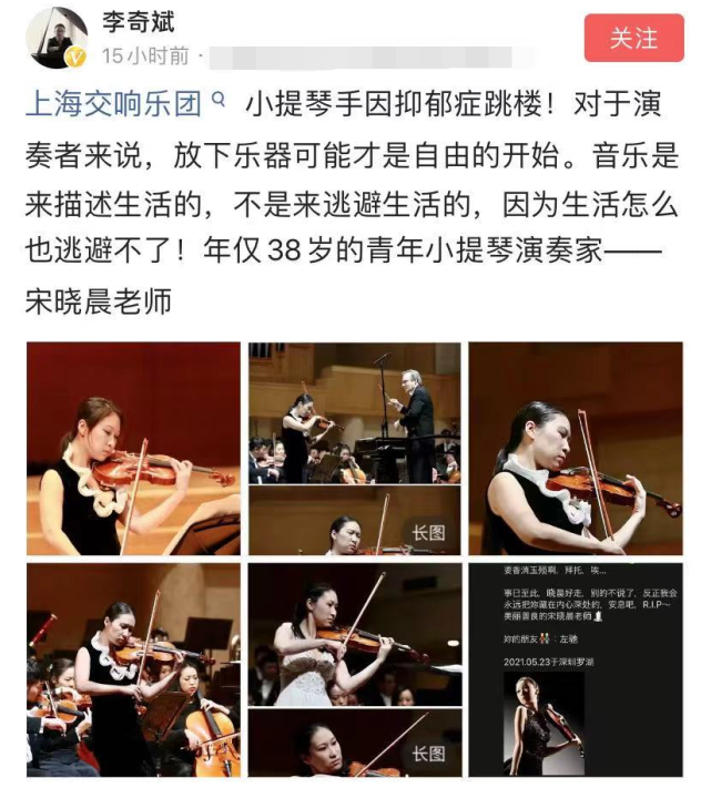 近日,又一位艺术家跳楼身亡了,她就是小提琴家宋晓晨。宋晓晨生前是上海交响乐团的首席小提琴家,她5岁开始学习小提琴,还曾到国外进修。经过多年努力,宋晓晨在小提琴上颇有造诣,她曾被视为音乐界冉冉升起的新星。
