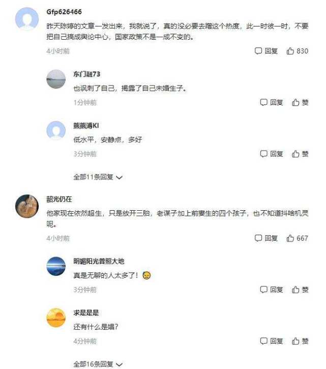 陈婷发文表示提前完成任务,张艺谋工作室对此表示力挺,网友们怎么看呢?一些网友质疑陈婷发文的动机,她是想炫耀还是想叫屈?为自己提前完成生三个孩子的事情而感到光荣吗?但是真的光荣吗?
