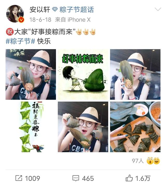 早几年安以轩晒出了自己制作粽子的过程还有卖相不错的成品,照片中的她手拿粽子的照片,表情俏皮搞怪看着也是分外的可爱了。