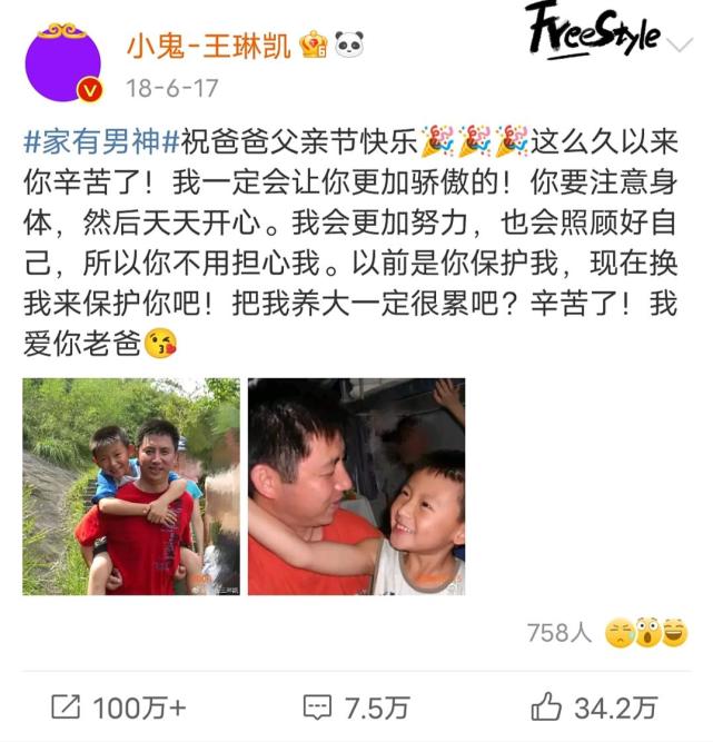 同样也是选秀出道的小鬼王琳凯,自己参加了许多的选秀节目,后来在《青春有你》节目中顺利出道,和蔡徐坤、范丞丞等人组成ninepercent组合,收获一票粉丝。而在父亲节当天,他也是发了和爸爸童年一起玩乐的合照庆祝父亲节并感谢爸爸的付出。