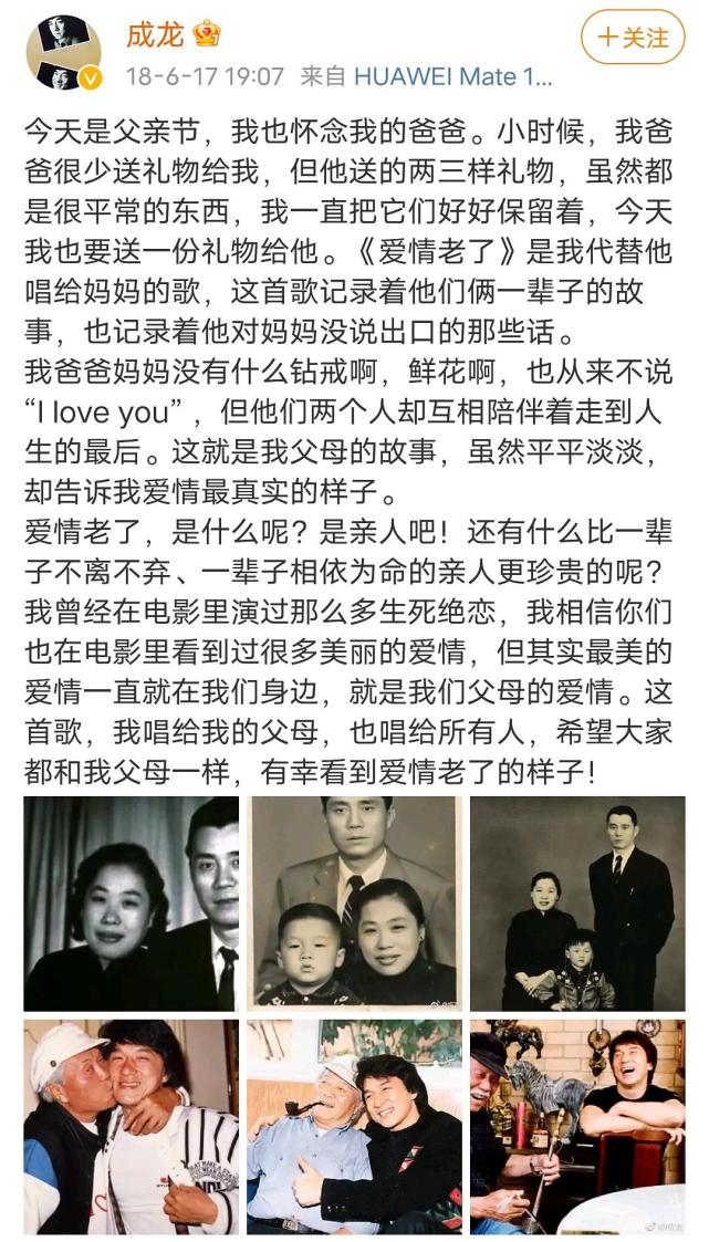 之前成龙晒出一组具有年代感的照片,并以一首《爱情老了》深情表白父母,老一辈相濡以沫的爱情总是那么让人动人,这份恩情确是这辈子最珍贵的回忆。