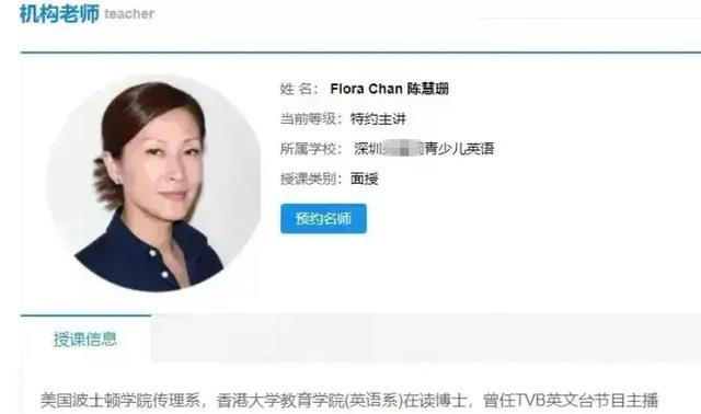 最近,有人发现在深圳的一家培训机构的宣传网页上出现了陈慧珊的身影,她竟然是这家培训机构的老师。当年陈慧珊进入香港大学进修的就是英文,所以来深圳做英语老师也算是专业对口。而且大家都知道香港明星的薪水并不高,很多明星在演戏之外还需要去做兼职才能养活自己,所以陈慧珊来深圳做英语老师也没什么可奇怪的。