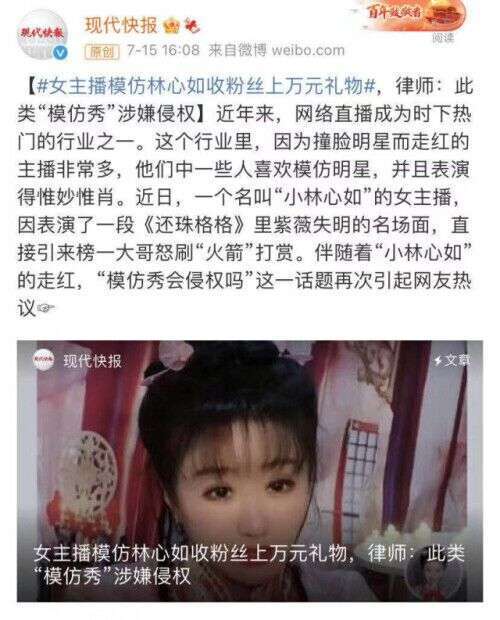 网红自称小林心如,上演紫薇失明求礼物,不难看出她是通过模仿表演蹭热度。那这样做存在风险吗?答案是有的。赵薇版《还珠格格》是国民度很高的古装剧,林心如凭借演紫薇这个角色走红。而根据有关法律规定,模仿活动中,如果对原表演者的形象有所贬损、歪曲,那有可能被认定为侵犯了原表演者的权益。