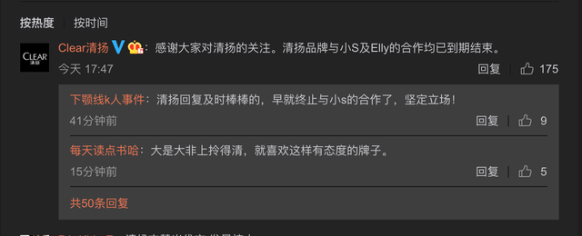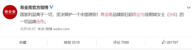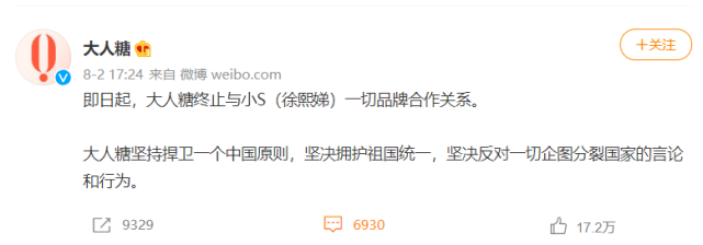 清扬官博发文,称:“国家利益高于一切,坚决拥护一个中国原则!”,随后,终止与小S的一切品牌合作,网友直呼:做的漂亮!而后寿全斋、大人糖等内地代言全部发出解约声明,还有其女儿许曦文的代言也受到影响……