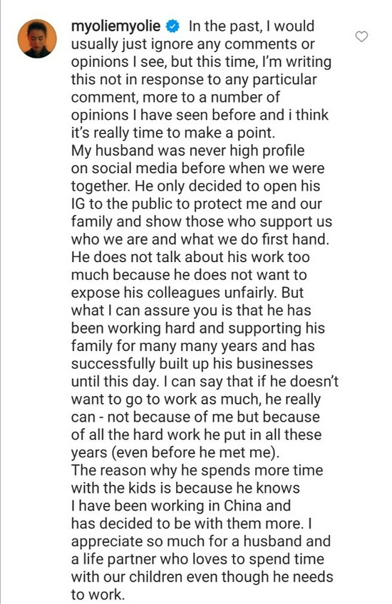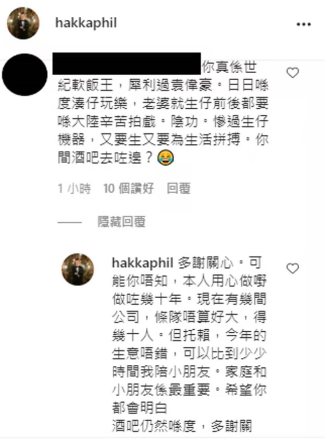 8月9日,胡杏儿老公在社交平台上分享了两个儿子雨中漫步的身影,却被网友嘲是“世纪软饭王”,还称胡杏儿在生娃前后都辛辛苦苦地拍戏,而他却每日以逗娃为乐。对此,胡杏儿老公李承德则回复道“自己已经拼博事业很多年,现在也有好几间公司,而且今年公司生意还不错,所以有些时间陪孩子”,并称“孩子和家庭是最重要的”。