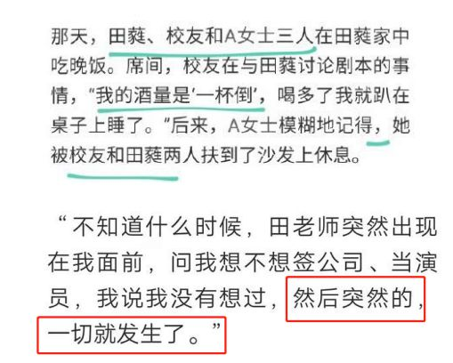 事后,田蕤完全没有一点惭愧之心,反而是和A小姐谈起了感情,想凭借自己的名声和权势让A小姐默认他的“犯罪行为“,还给A小姐提供了许多职业规划的选择,而在他眼中,他并不觉得自己的行为是犯罪,而是酒后发生的 一些“不光彩的事情”。