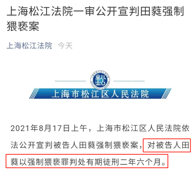 就在2021年8月17日上午,国家一级演员田蕤强制猥亵案终于公开宣判了,上海市松江区人民法院依法对被告人田蕤以猥亵罪判处有期徒刑两年6个月,对于法院这样的宣判,不少网友拍手称好,觉得这真的是大快人心。