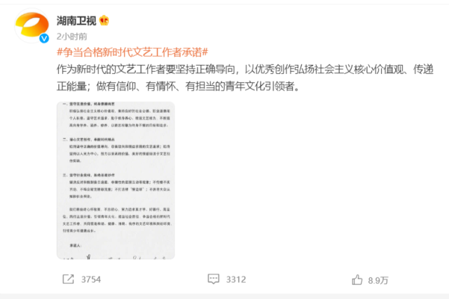 最近,霍尊、张哲瀚等明星人设坍塌再度引发大众对于艺人艺德的关注和热议。从霍尊翻车到张哲瀚从顶流跌落,无一不表明德不配位,必有灾殃。从艺先从德,湖南卫视官博发布了湖南卫视18位主持人签署文艺工作者承诺书的消息。