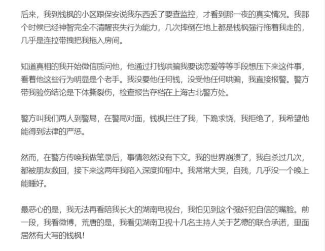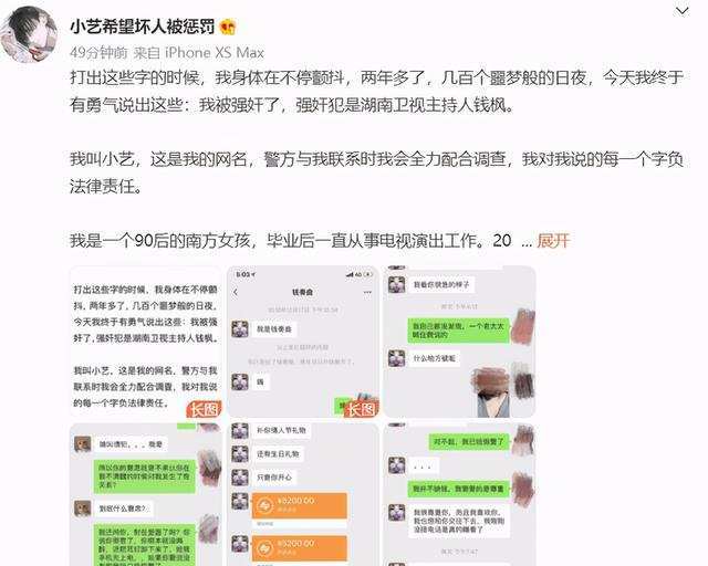 今天下午一位名叫小艺的女网友在微博上发表了长文,自述2019年自己被钱枫性侵的事情。该女生从事电视演出的相关工作,在2018年参加了《天天向上》节目录制,结束后便有工作人员向她索要联系方式,表示钱枫想要加她好友。