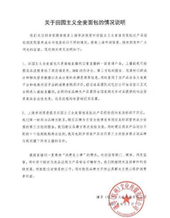 上海市消保委都喊话薇娅了,希望她在宣传时应真实科学,这种低标行为不仅是不诚信的体现,而且还是不负责任的行为。薇娅方面如何回应此事呢?薇娅方面表示田园主义全麦面包只是薇娅直播间日常直播的一款普通产品,被曝出了问题后已经和品牌方联系过了。薇娅方面还表示停止与田园主义全麦面包的合作。