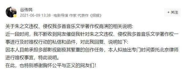 而早前与朱之文闹版权纠纷的导演、作家谷传民在微博写道:从大衣哥的这张照片,你们也许会知道他为什么不想给我版费了。原来的纯朴一旦被傲慢代替,那将是一条不归路。令人遗憾与心痛。版权的事,最初我只要他一个道歉他都不愿意给,可现在我方律师已完成第一阶段事宜,将进行第二阶段跟进。
