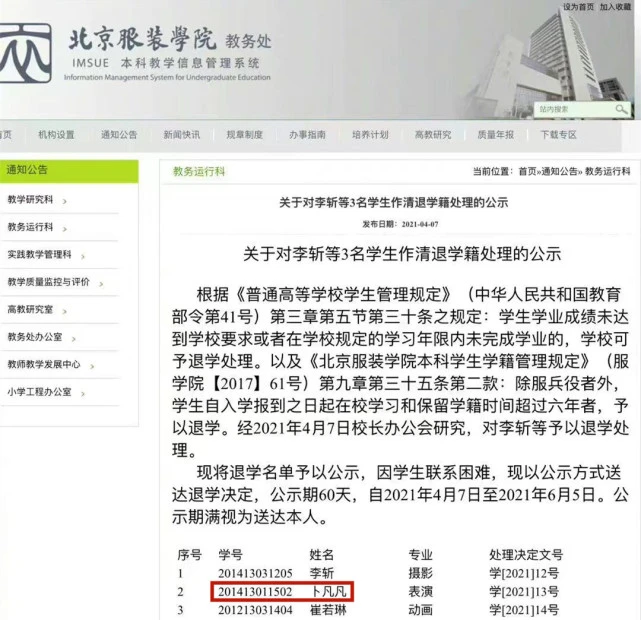 据悉,卜凡是2014级的学生,曾以第二名的成绩考进来,至今为止,他入读北京服装学院差不多七年的时间,不过中间经常挂科。如今被退学,想来校方也是有自己的理由的。校规上有明确规定,只要入学报到之日起在校学习以及保留学籍的时间超过六年,就可以将学生退学。