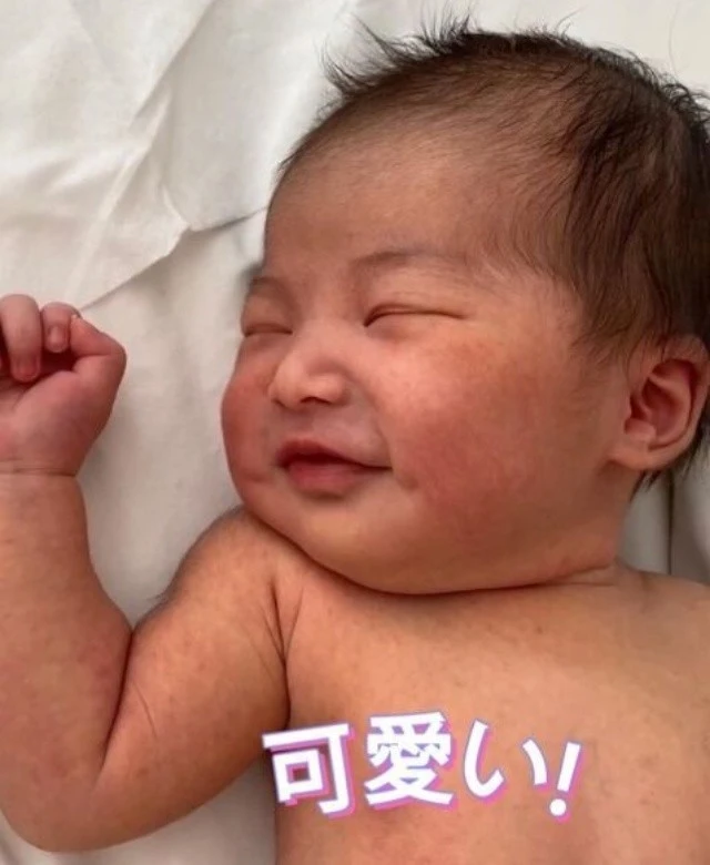 照片中,小珍珠整个身体肉嘟嘟的,与妈妈朱珠一样,鼻子高挺,拥有两个可爱的小梨涡,还带着甜甜的笑容,完美继承了妈妈的标志性小梨涡。