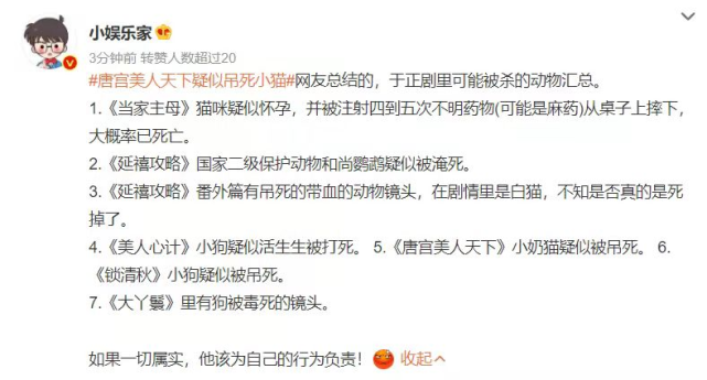 在这之后网上的爆料越来越多,比如说《延禧攻略》剧组疑似虐杀了一只鹦鹉。这些事情的真假还没搞清楚呢?又有新的消息爆出《唐宫美人天下》剧组疑似曾经吊死一只猫。不久之后这则消息便借着之前的热度上了热搜。