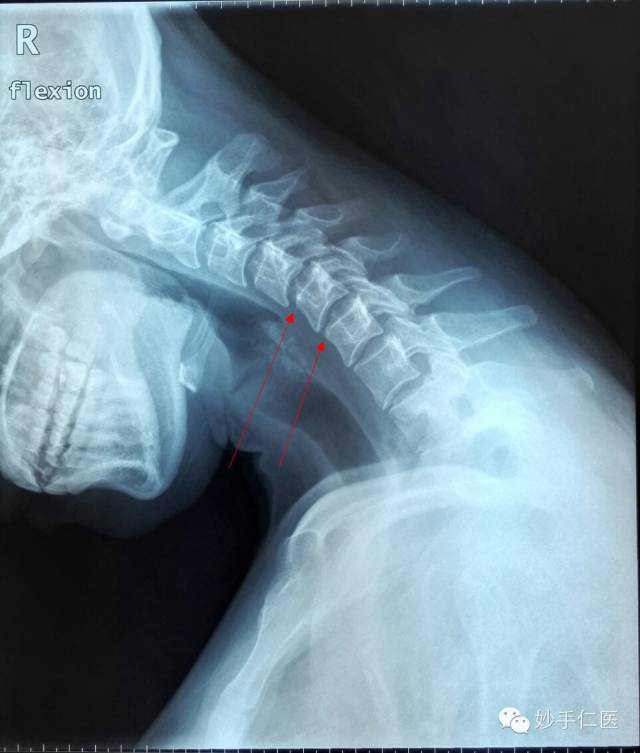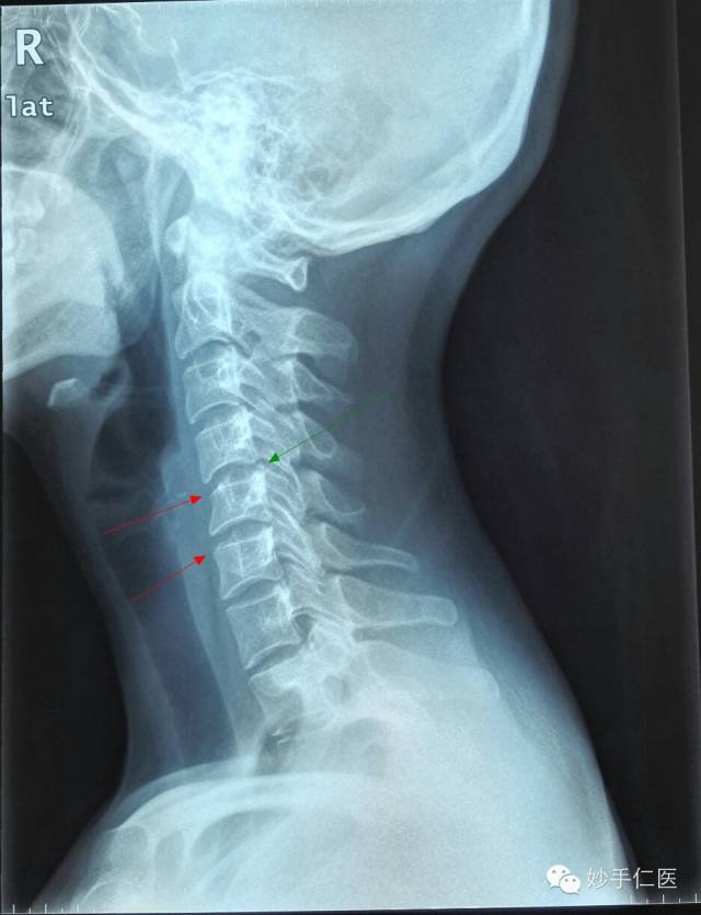 http://mmbiz.qpic.cn/mmbiz/Qo7L42bib5MJe45CCmsBlVRlrZy6kanZmjoFuT579g7ybEKJ7O4MvGIeODX463gK7ENmC0ibc6CpzTQIO1oP58Eg/640?tp=webp&wxfrom=5 颈部侧位片子:颈部曲度消失,出现颈部反向弯曲(绿色箭头);颈5、颈6椎体前缘出现骨质代偿性改变(红色箭头)。