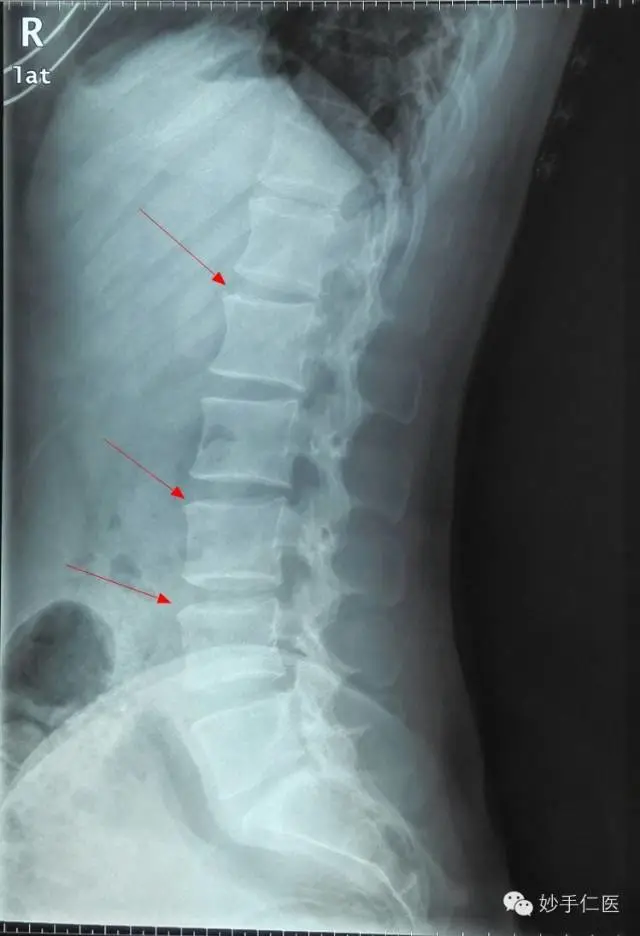 腰椎侧位片子:腰椎椎体前缘存在代偿性的骨质变化(红色箭头)。这种变化,和不良坐姿密切相关。