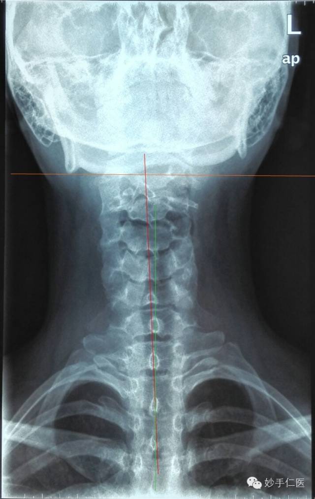 颈部正位片子:头颅向右侧偏歪,颈椎和胸椎存在微小侧弯。