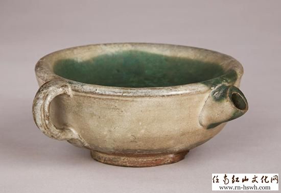 邛 窑绿釉省油灯为1951年邓只淳捐赠,敞口,腹微鼓,腹下渐收呈假圈足。短灯嘴置于腹部一侧,通至腹内,另一侧置环形柄,器身为碗形夹层,中空,夹层内可 注水降低油灯的热度,减少油的过热挥发,以达到省油的目的。灯面中间与嘴均施绿釉,灯盏外壁上腹施灰白釉,下腹与底无釉。(据重庆中国三峡博物馆)