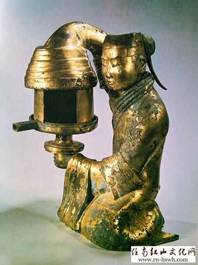 长信宫灯于1968年在满城中山靖王刘胜妻窦绾墓出土,通体鎏金,作宫女跪坐执灯形象。宫女梳髻覆帼,着深衣,跣足。由头部、身躯、右臂、灯座、灯盘、灯罩 等部分组成。各部分可拆卸,灯盘可转动,灯罩可开合。宫女体臂中空,右臂为烟道,可将灯烟导入器内,以保持室内清洁。灯上刻铭文九处,内容包括灯的重量、 容量、铸造时间和所有者等。因刻有“长信尚浴”字样,故名长信宫灯。(据河北博物馆)