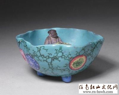 此 为宜兴窑作品。杯呈荷叶状,圜底,钉状三足。整器以宜兴紫砂为胎,内外施绿釉,外壁点缀团花。杯内心为一头梳双髻、袒胸露腹、笑容可掬的仙人,面对一施黄 彩的圆柱而坐。圆柱中空,内有紫砂陶质细长浮柱,作寿星状,圆柱上围绕浮柱有5个红点。公道杯产生于宋代,在饮酒时用于行令,以助酒兴。此杯圆柱上的5个 红点分别指向在座的饮酒之人。当酒慢慢倒入杯中时,圆柱中之浮柱缓缓上升,寿星面对哪个红点,便由相应之人饮酒。浮柱上有刻度,当刻度露出时若还继续斟 酒,则被视为有失公允,酒会从仙人身下的小孔处流出杯底。