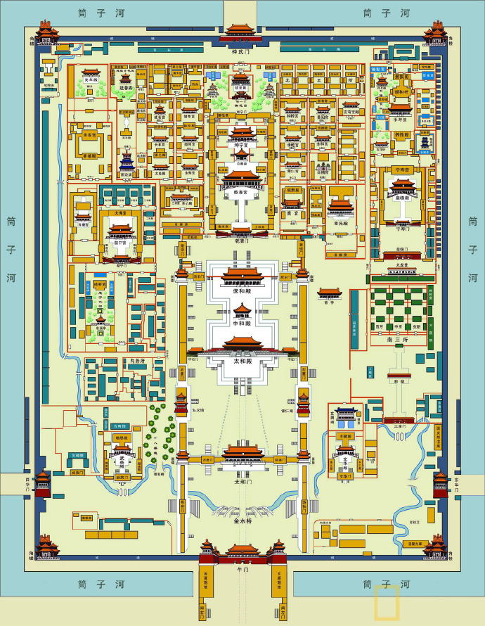 北京故宫于明成祖永乐四年(1406年)开始建设,以南京故宫为蓝本营建,到永乐十八年(1420年)建成。它是一座长方形城池,南北长961米,东西宽753米,四面围有高10米的城墙,城外有宽52米的护城河。紫禁城内的建筑分为外朝和内廷两部分。外朝的中心为太和殿、中和殿、保和殿,统称三大殿,是国家举行大典礼的地方。内廷的中心是乾清宫、交泰殿、坤宁宫,统称后三宫,是皇帝和皇后居住的正宫。