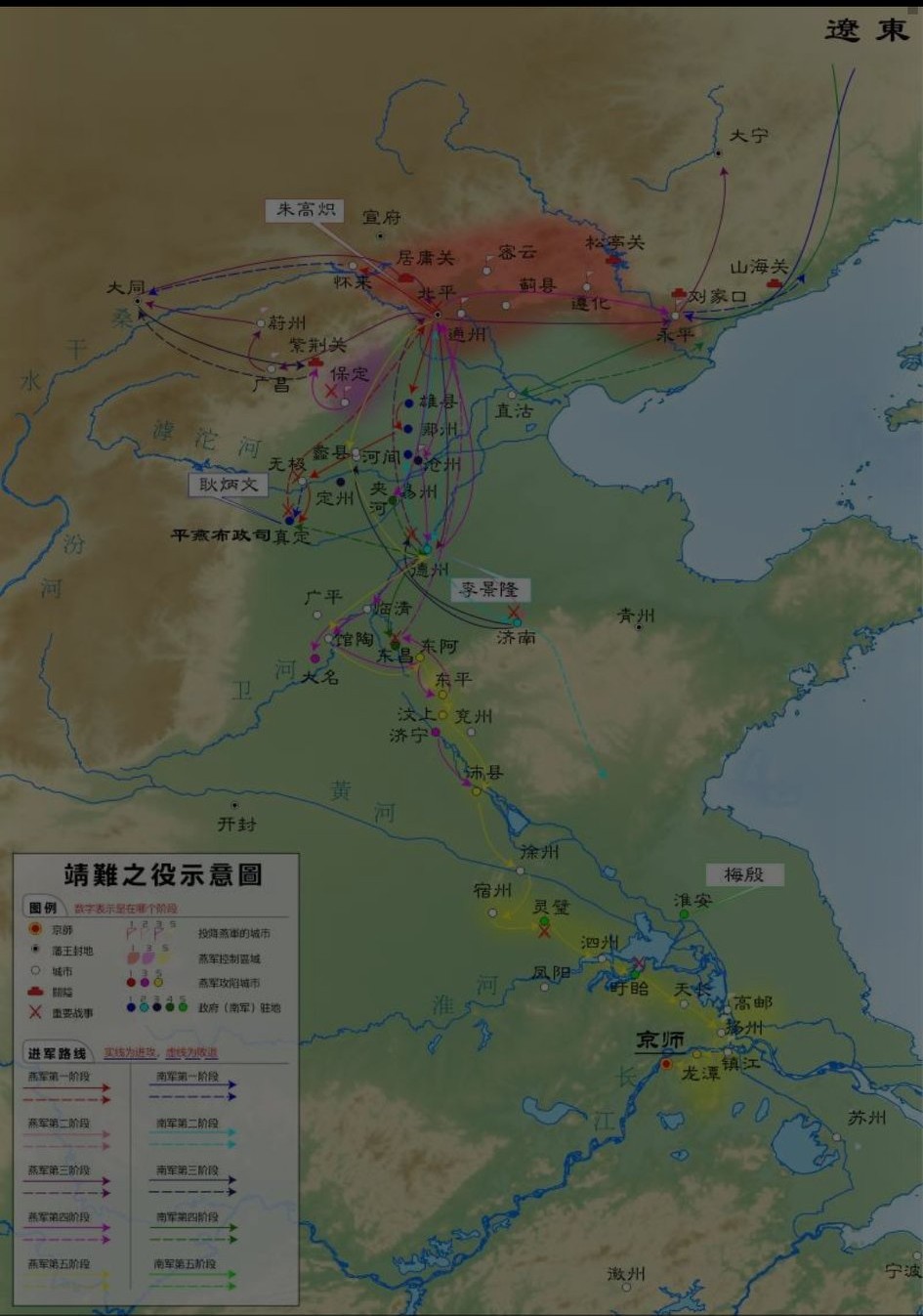 靖难之役是建文元年(1399年)到建文四年(1402年)明朝统治阶级内部争夺帝位的战争。战乱中建文帝下落不明,有人说建文帝于宫中自焚死,有人说建文帝由地道逃去,隐藏于云、贵一带为僧。战争历时四年,1402年燕王朱棣攻下帝都应天(今江苏省南京市),控制南京,夺取皇位,成为历史上的明成祖(次年改年号为永乐,又称为永乐皇帝)。