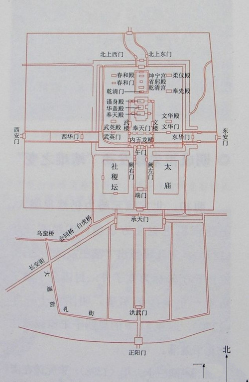 南京故宫始建于元朝至正二十六年(1366年),明朝洪武二十五年(1392年)基本完工,前后历时二十六年,布局依《周礼·考工记》中载“左祖右社、面朝后市”为原则。皇城周长10.23千米,宫城周长3.45千米,洪武门至承天门两侧为中央官署区,承天门至午门两侧为太庙、社稷坛;前朝以奉天殿、华盖殿、谨身殿为核心,东有文华殿、文楼,西有武英殿、武楼;后廷以乾清宫、坤宁宫为核心,东有春和宫,西有柔仪殿、奉先殿、大善殿、九五飞龙殿、西宫,两侧为东西六宫。