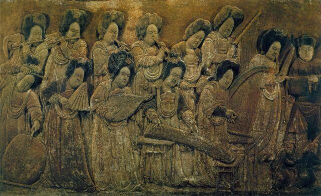 彩绘散乐浮雕上的乐器,除了曲项琵琶(前排中)、筚篥(后排左三左四)、箜篌(前排右一)、答腊鼓(节目里拿出了羯鼓,后排右三)、拍板(前排左二)之外,还有筝(前排右二)、笙(后排右一)、方响(后排右二)、鼓(前排左一)、横笛(后排左一左二)。其中有不少,如箜篌、横笛、答腊鼓、曲项琵琶等,都出自西域龟兹、疏勒、波斯等地。