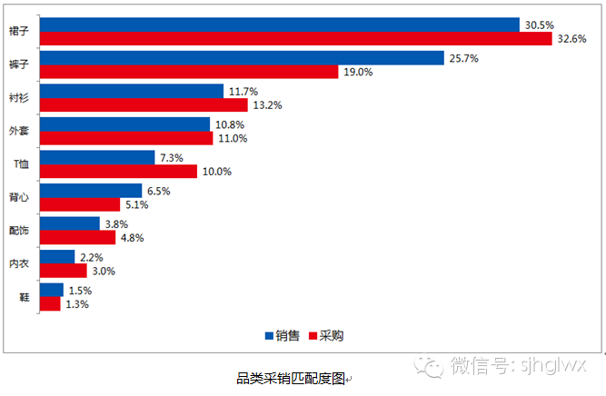 采销匹配度不是一个具体的指标,它实际上是一种分析方法。通过对比品类、型号、价格等方面在某段销售周期内采购和销售的比重来判断商品销售进度的一种方法。如图所示,这是一个服装店铺品类采销匹配度的对比图。从中可以很直观看出差异比较大的是裤子和T恤。