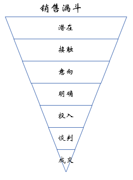 销售漏斗指的是将从发现商业机会开始到最终与客户成交为止的销售过程按照不同的销售进度分为几个不同的销售阶段,每个销售阶段代表一个已经达成的某种销售进程。在销售漏斗中销售阶段的数量及设定方法依据企业的经营方式不同而不同。